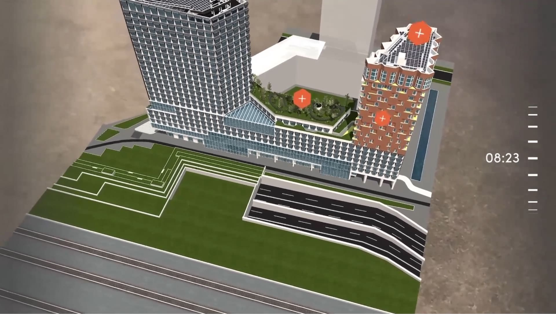 In this case, we created an animated scene with a panoramic view to show the smooth movement through the main towers of The Pulse. It gives a clear idea of what the whole ensemble looks like and flatters a huge green space integrated into it.This animation turned out to be really efficient when it came to further promo content and branded video.